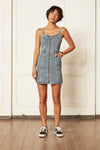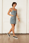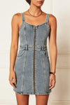 This cute denim mini dress flatters your figure and features a front zip.