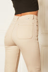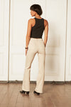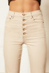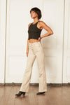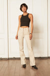 A little Boyish flare. The Ricky is a high waisted comfort stretch flare jeans that will hug your body in all the right places. This jean comes in a neutral eco wash with novelty buttons and a unique back pocket shape.