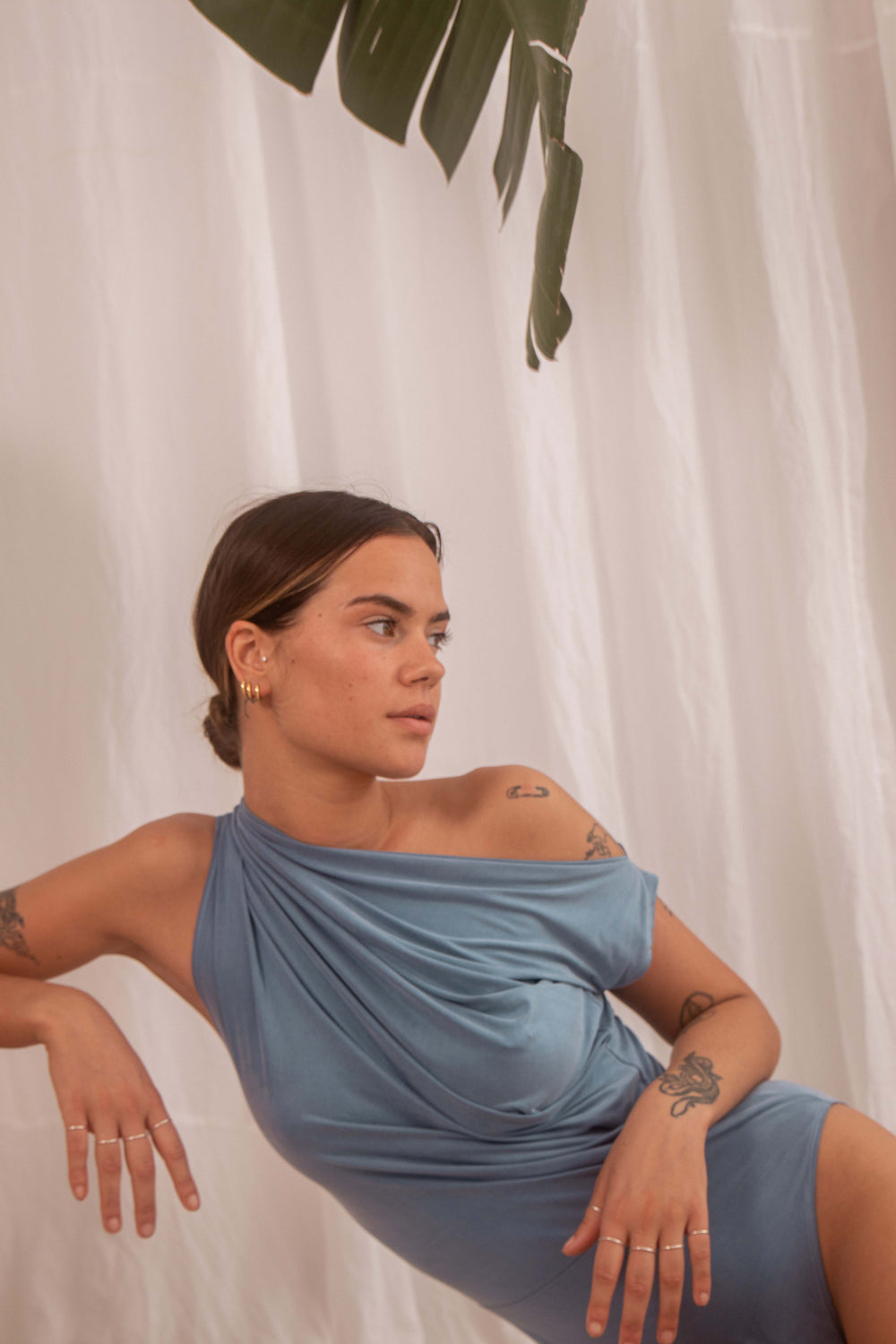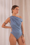 This sleek, slate blue bodysuit is crafted with cupro material, offering a flattering, feminine drape neckline. Style with your favourite jeans for an effortlessly chic, refined look.