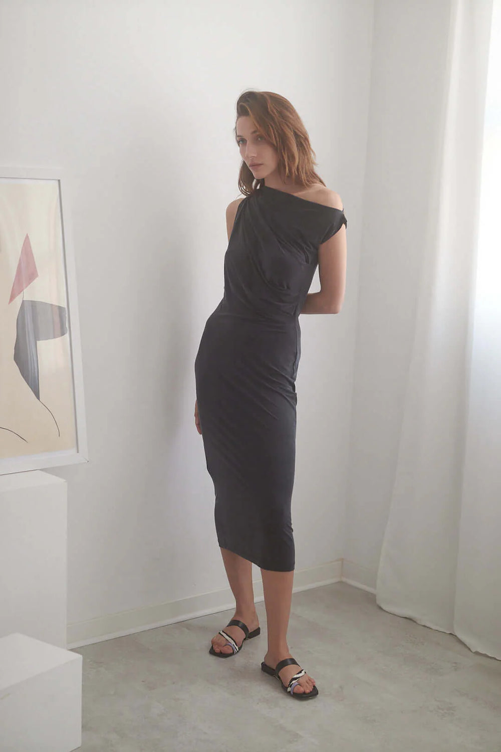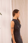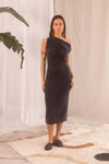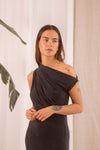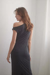 Crafted with cupro material, this elegant, slate black dress features a flattering, feminine drape neckline that can easily transition from casual to formal occasions.
