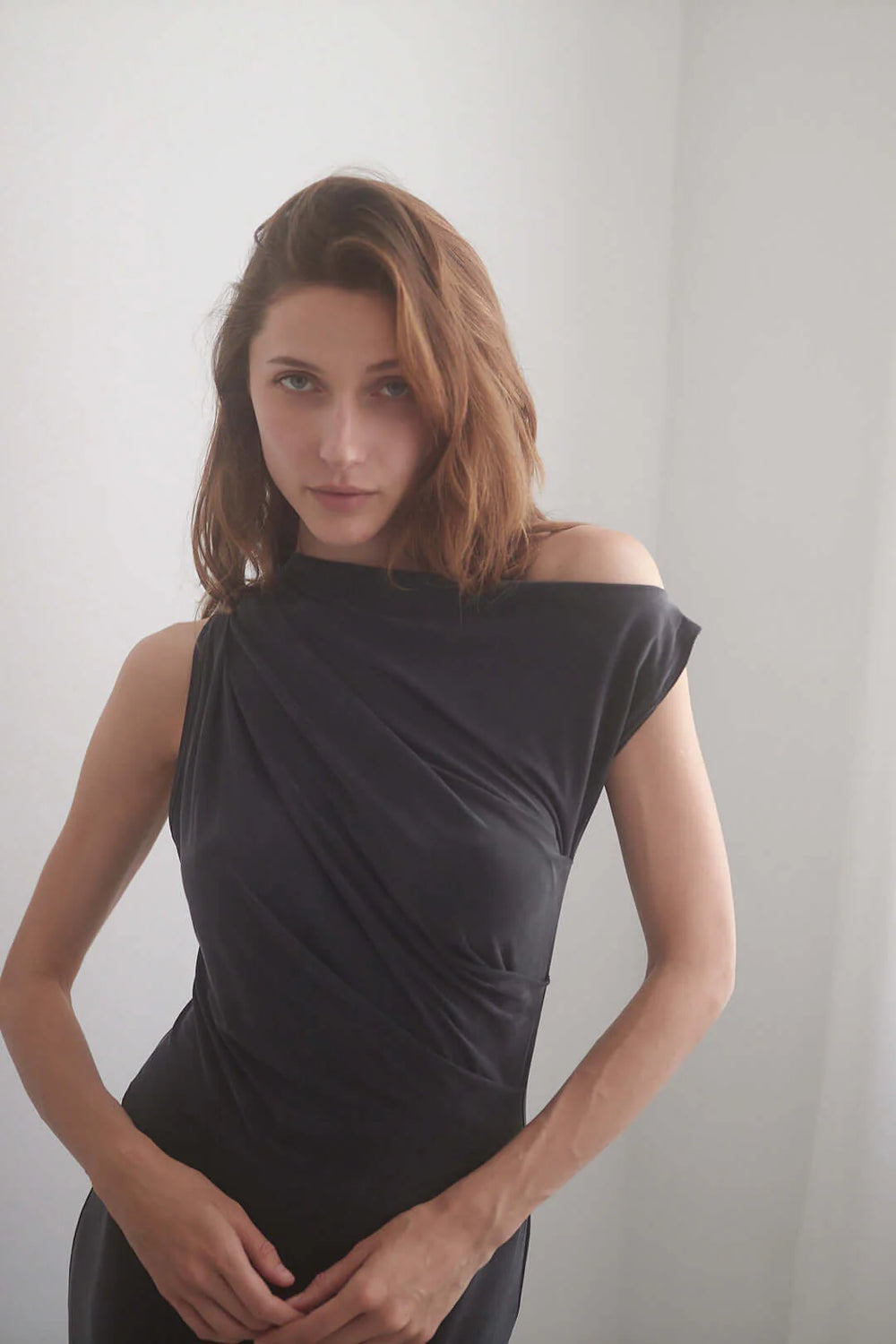 • Drape off shoulder neckline