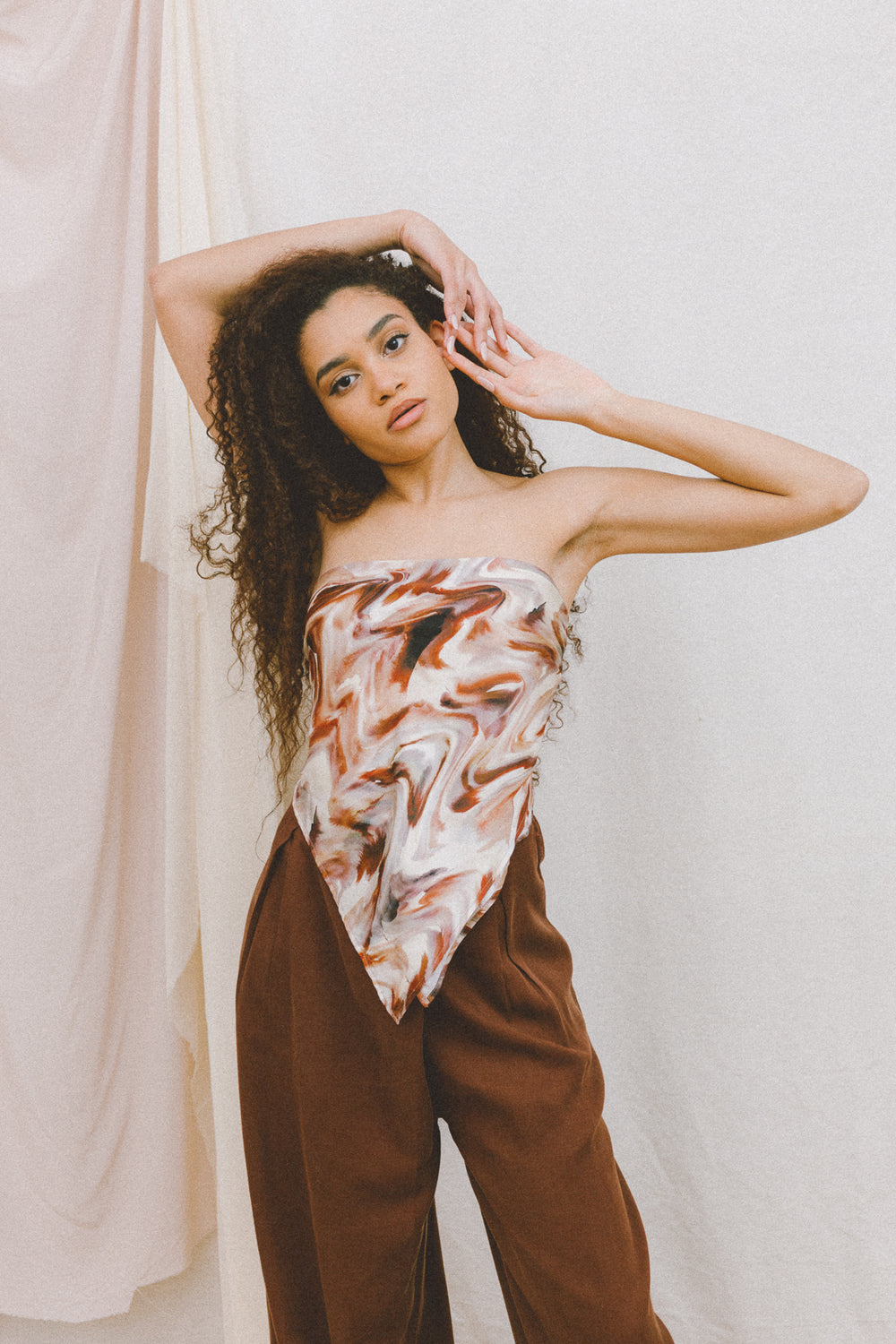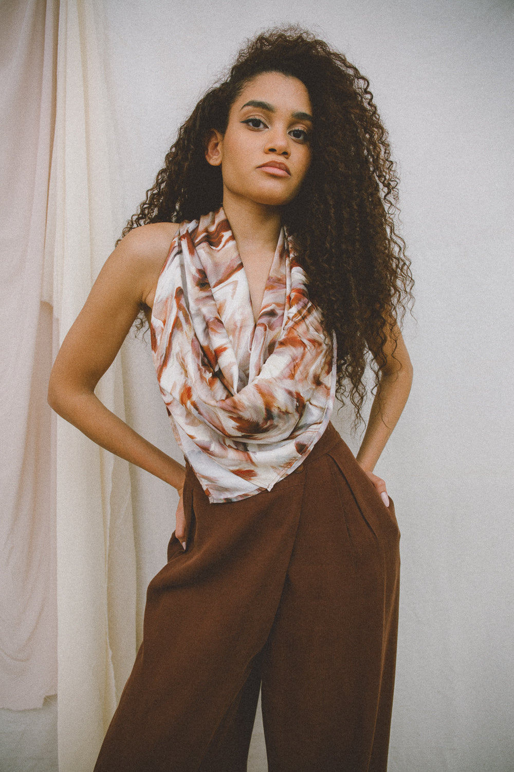 A perfect multifunction scarin a lovely autumn print. It allows many different styling; from a head scarf, belt to 3 different tops.