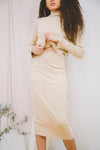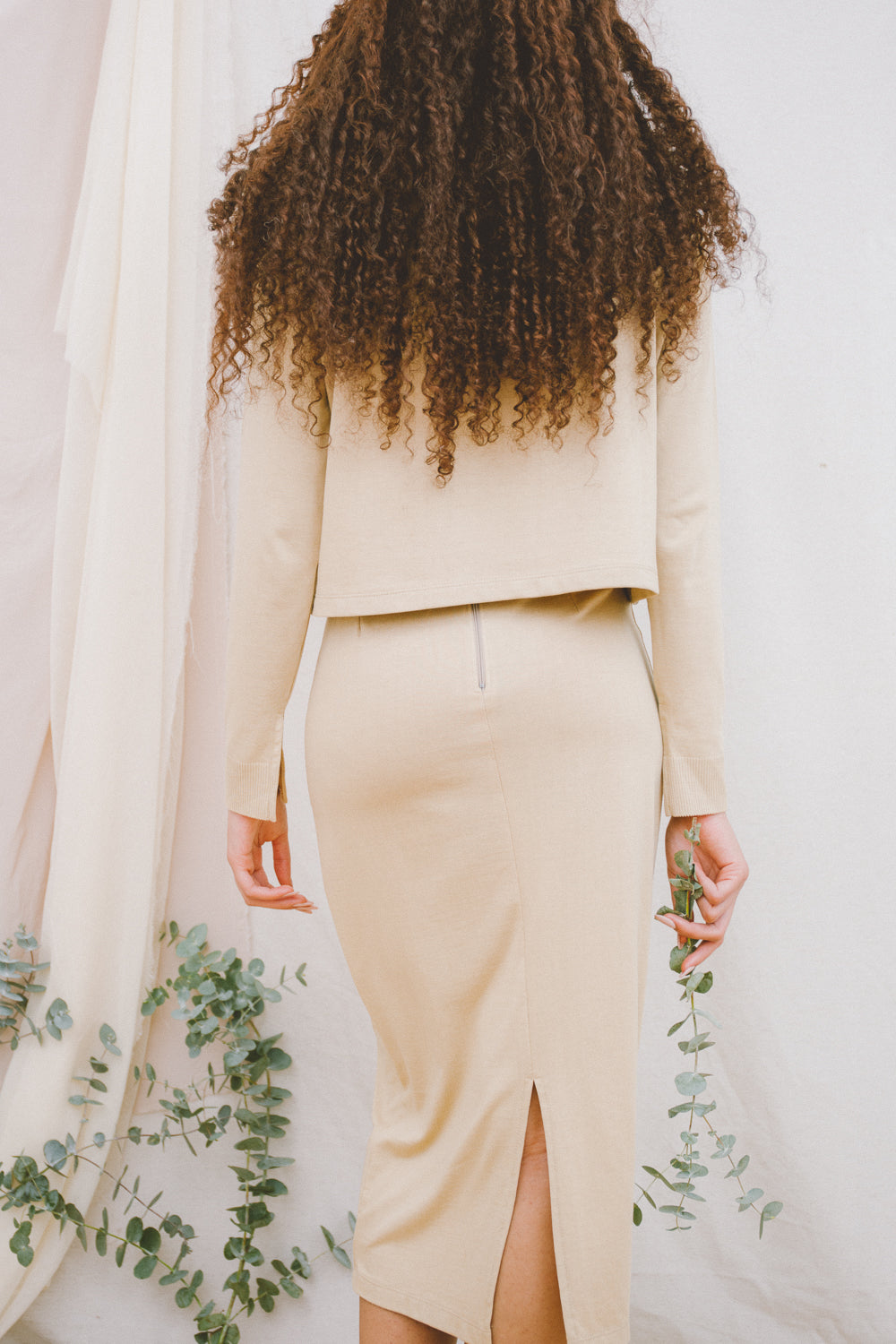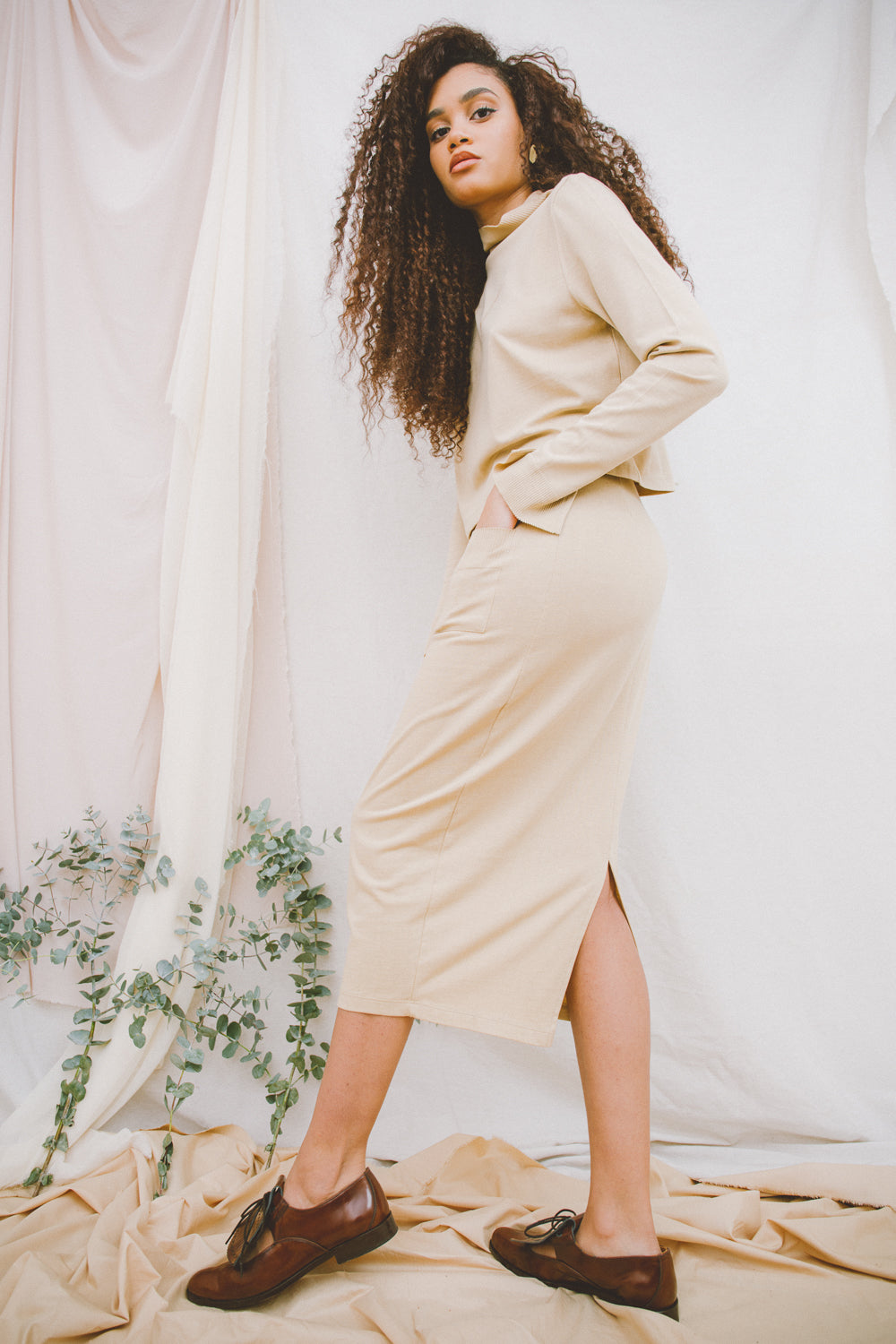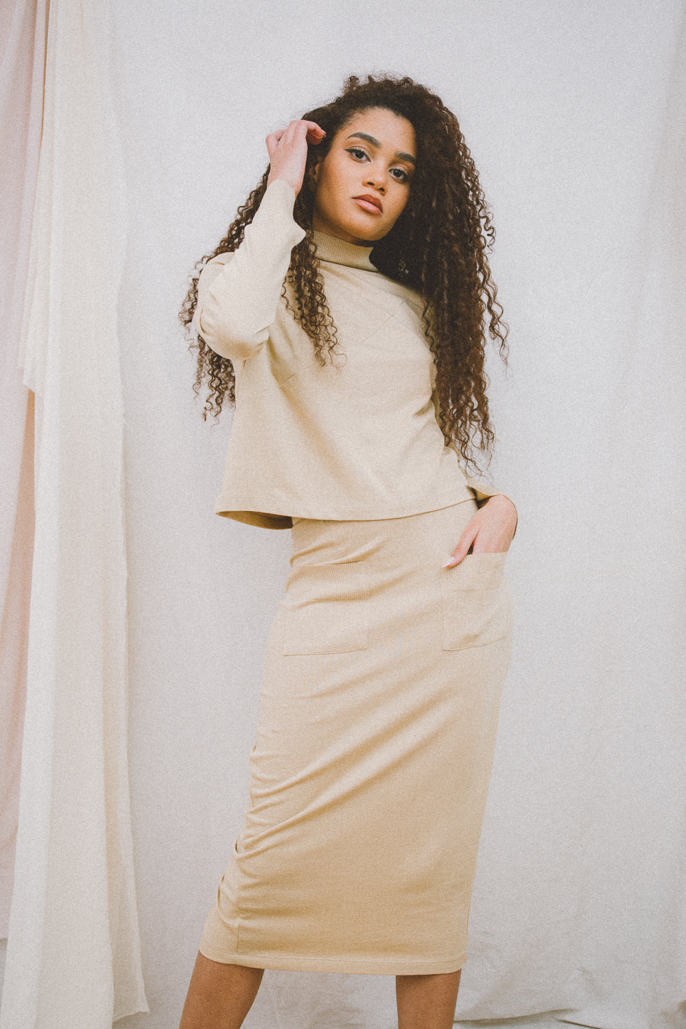 This knit skirt comes in easy pencil shape with rib pocket detail on the front which allows many different stylings & adapts to many occasions. Perfect worn with COSSAC's Ecru Knit Top.
