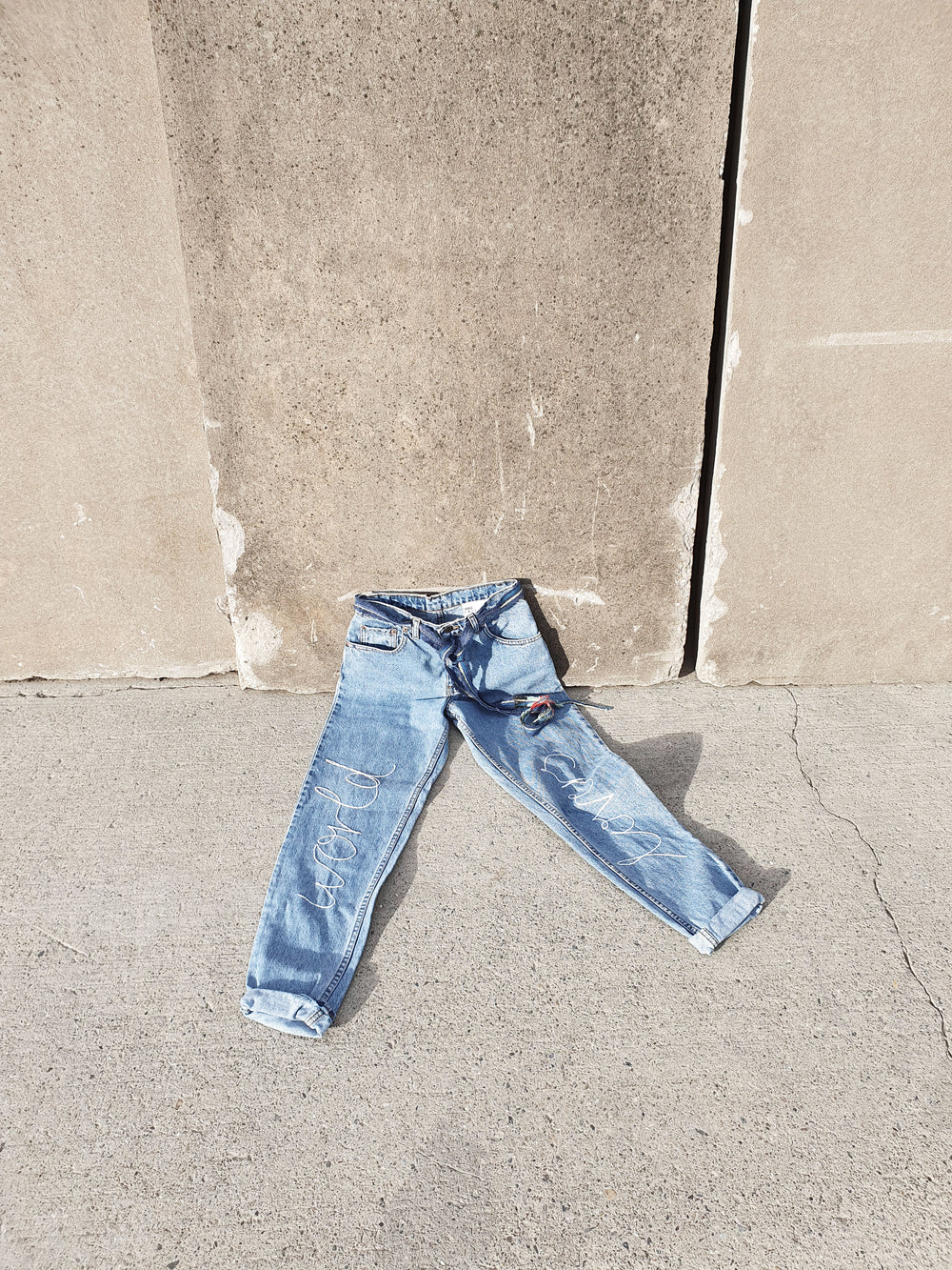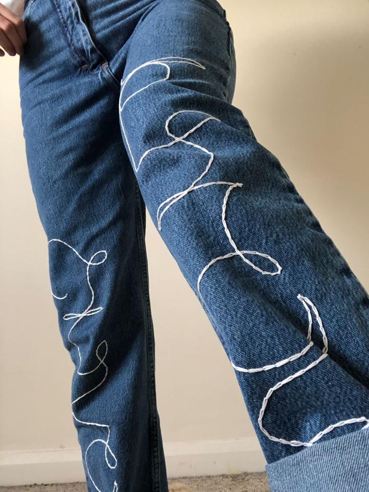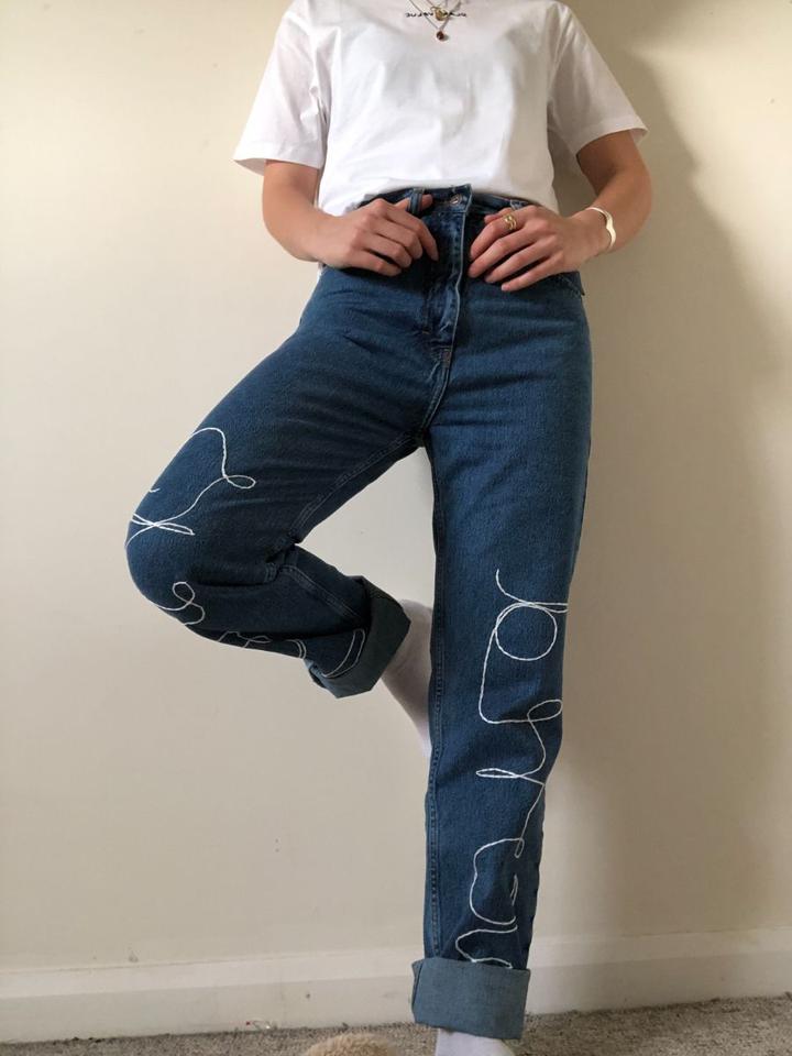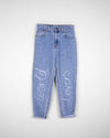 High waisted, relaxed fit vintage jeans re-designed and made from unused fabrics. Made unique with hand-embroidered message "World Lovers" or "Earth Kind".