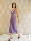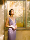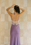 An elegant occasional dress option - lace satin-georgette slip dress with feminine lace details and design that makes this a special piece. She is a slim fit ankle-length dress with a lace-edged v neckline, sleeveless, spaghetti straps, and ties decoration at the back neck and waist.
