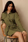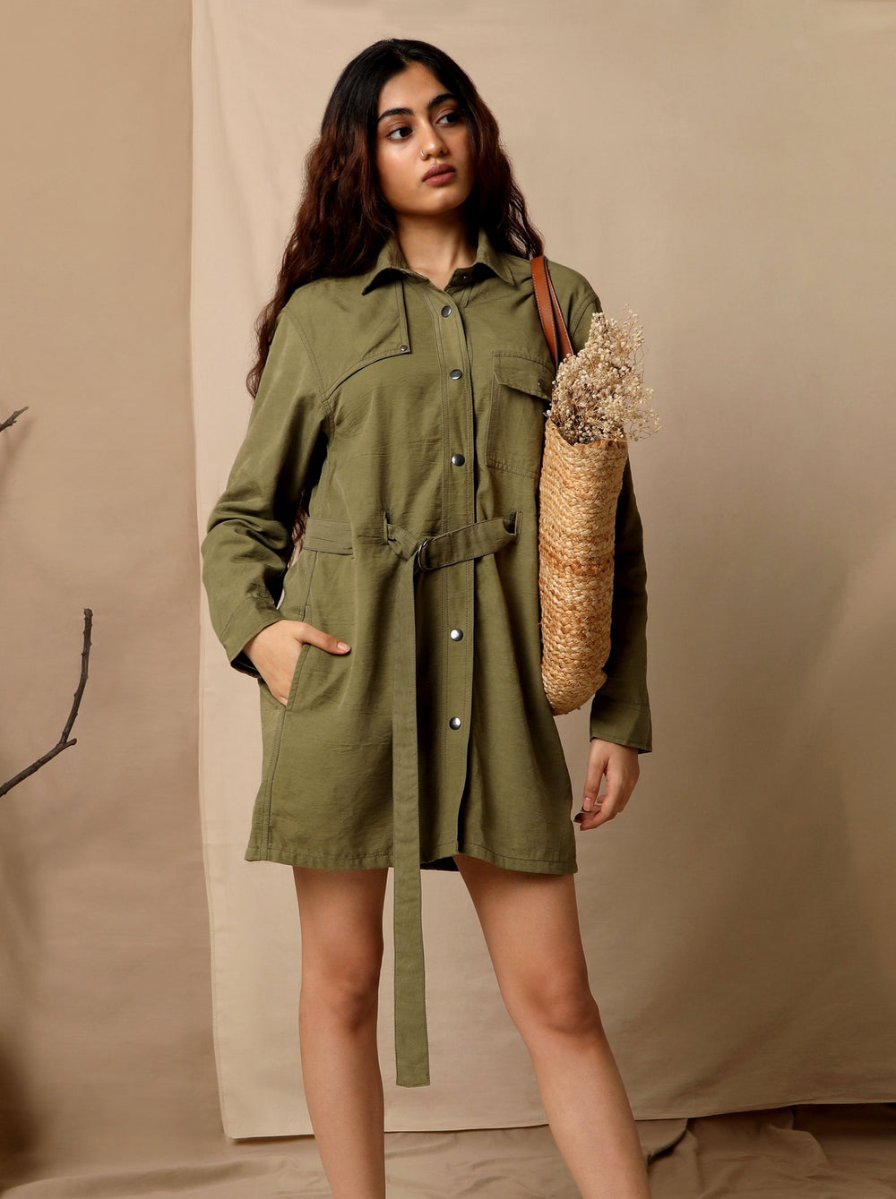 A shirt dress with uneven pocket details and a belt to clinch the waist.