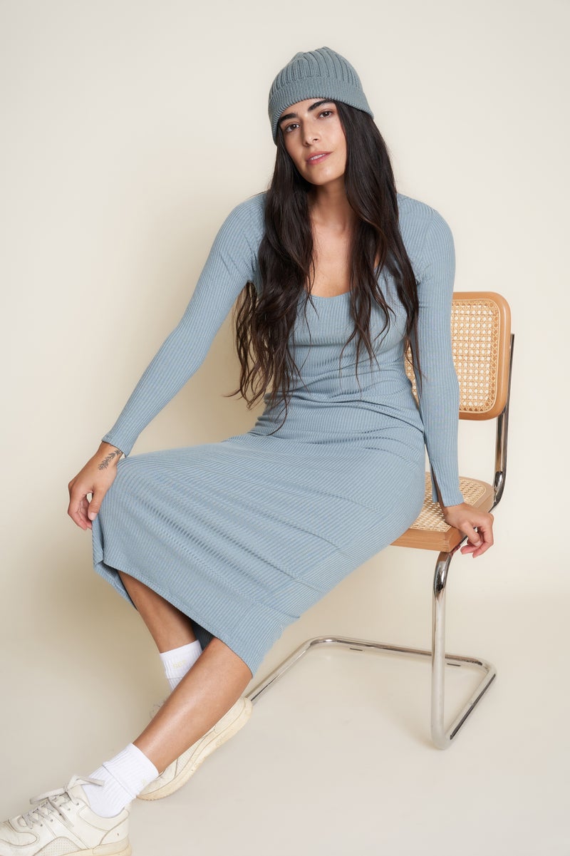 Our buttery soft rib offers a bodycon fit with a scoop neck. Completed with long sleeves and sleeve slits.