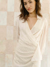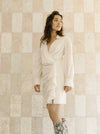 A dress with a holiday vibe. Bianca dress is a front crossed cotton striped seersucker dress, made from salvaged fabric. Its naturally draped-looking front body falls into a ruffle. She is cut for a regular fit, mini-length dress.