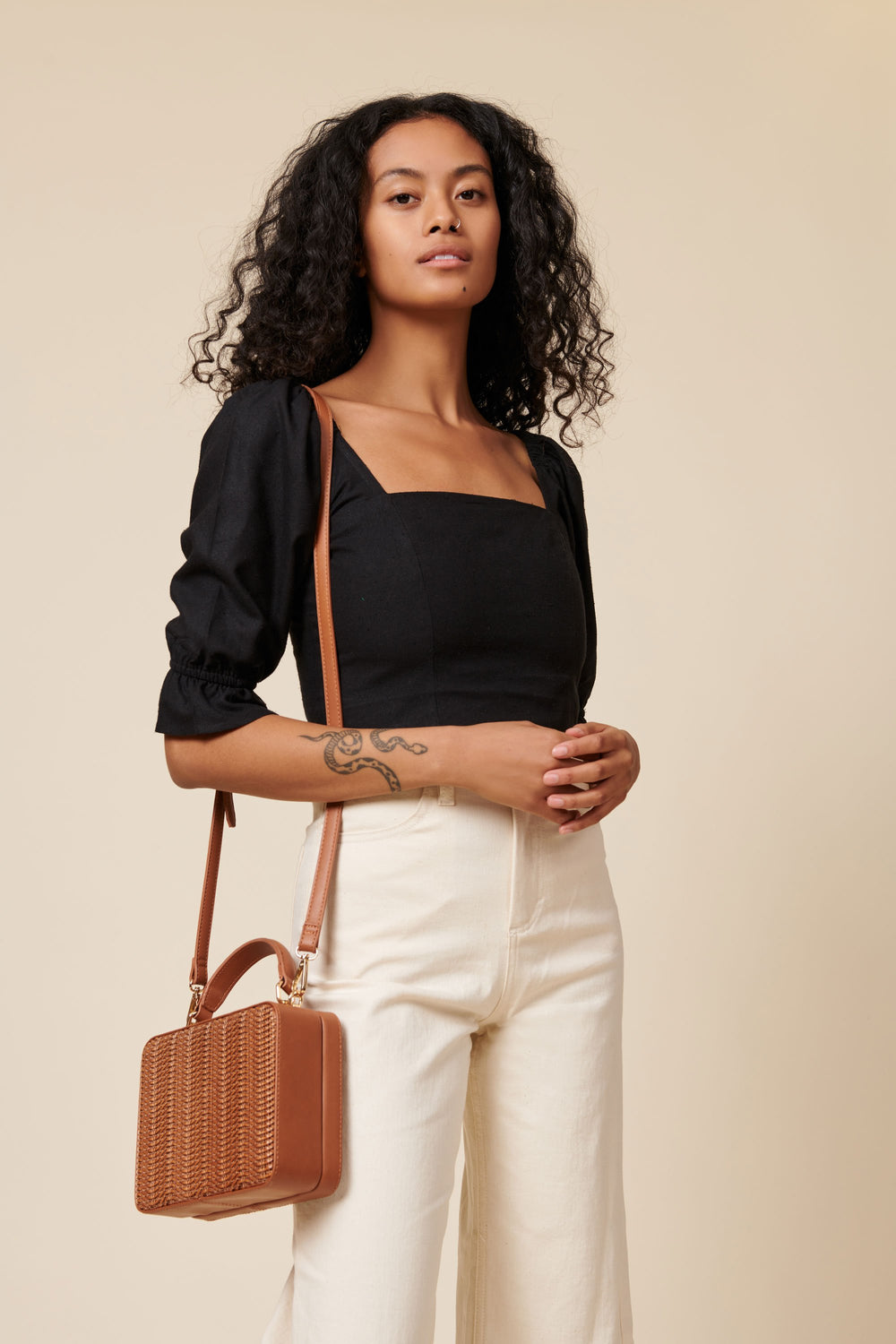 Made from raw silk, with a squared neckline and the cutest puff sleeves ever.