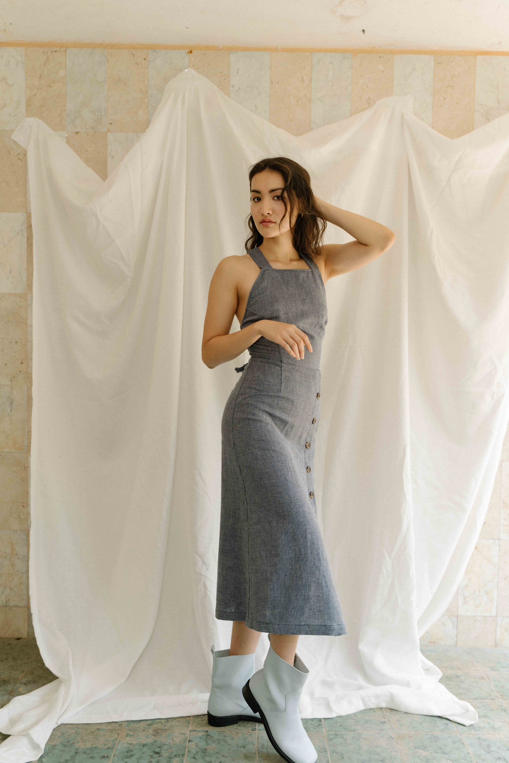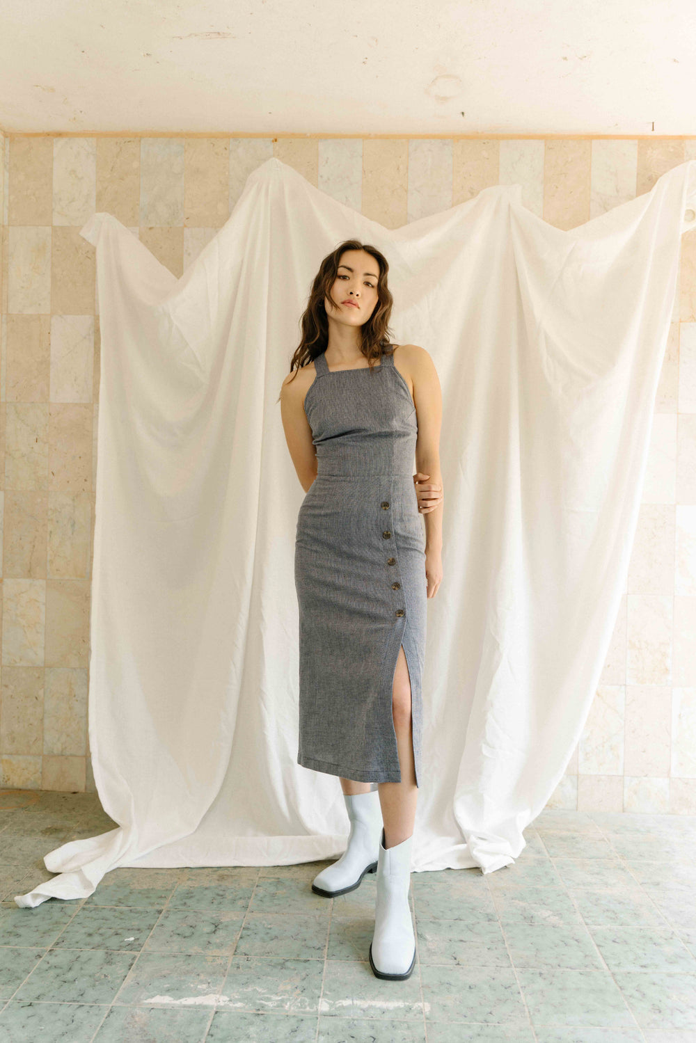 Open back sleeveless midi length dress with adjustable lace-up thick straps, square neckline, decoration buttons down with front slit. Olivia dress is a slim fit with a small straight A-line skirt. Sweep your hair up and show off your beautiful neck and shoulders.