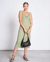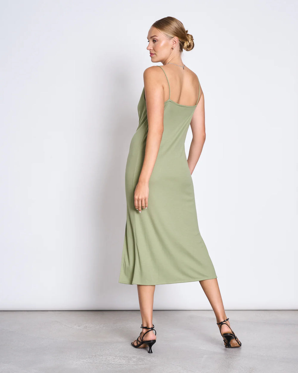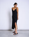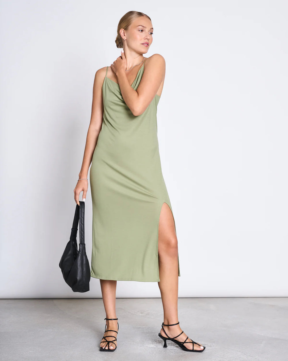 Helen dress has a waterfall neckline, to flatter all the boob shapes out there! Helen is a maxi dress with a long slit in the front part. It’s made out of Tencel™, a sustainable material based on cellulose that is rather flowy and has a cool touch.