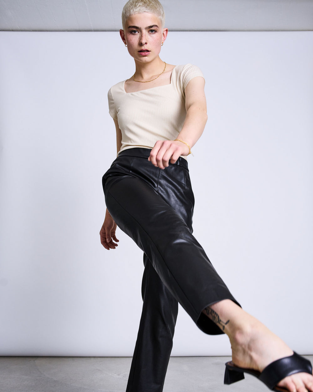 It is made from a flexible and comfy Tencel™ rib fabric which adapts to your body shape perfectly. The material is slightly transparent, so a thin bralette might be helpful, if needed. The fabric is ribbed and its handle is super soft and flowy.